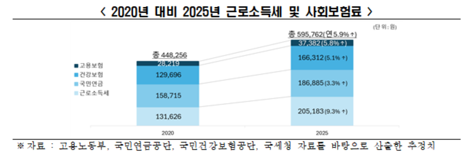| 2020년 대비 2025년 근로소득세 및 사회보험료 [한경협 제공] |