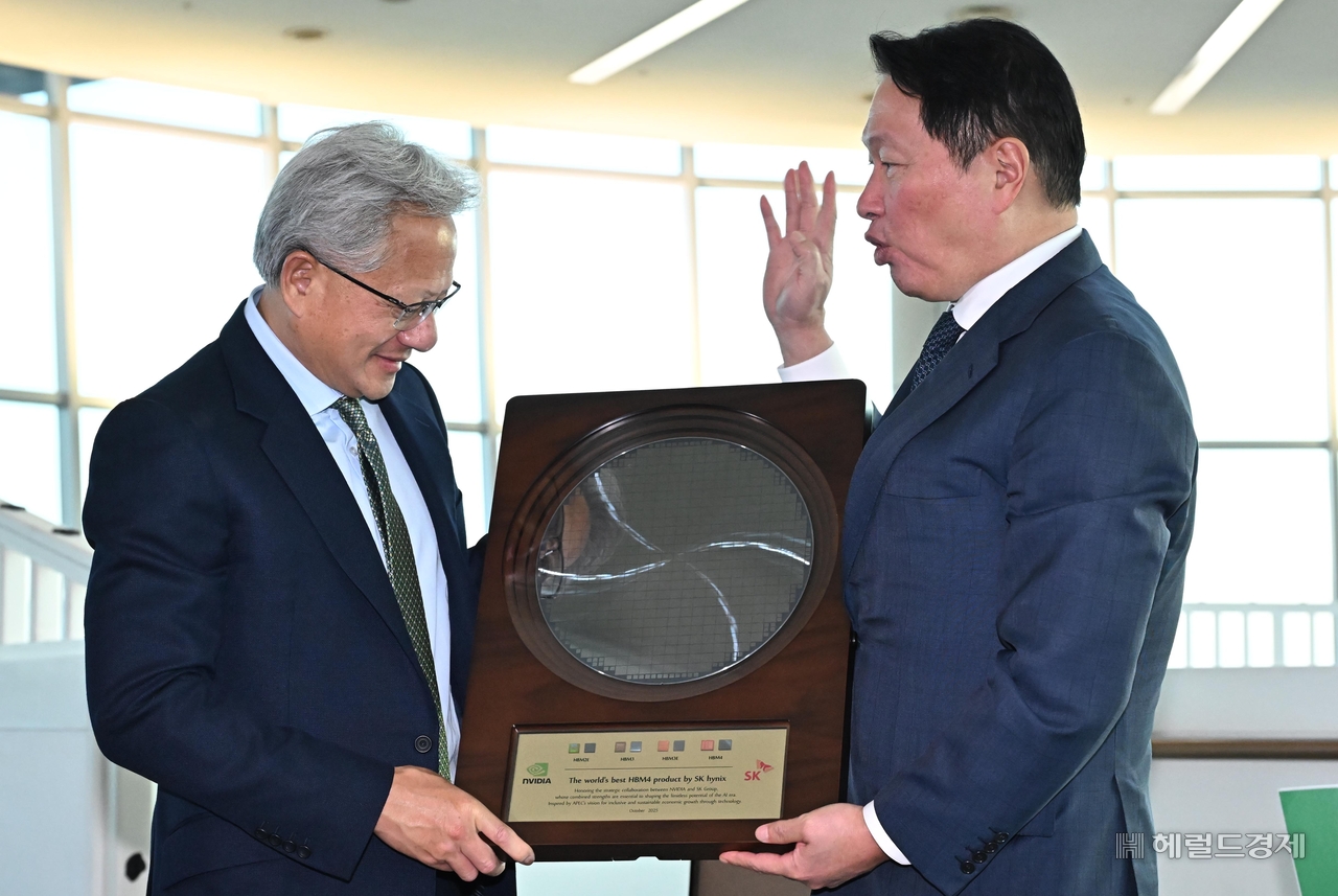 | 젠슨 황(왼쪽) 엔비디아 CEO가 지난 10월31일 경북 경주시 경주예술의전당에서 열린 APEC CEO 서밋 2025에 참석해 최태원 SK그룹 회장으로부터 SK하이닉스의 HBM4 반도체 웨이퍼를 선물로 받고 있다. 경주=임세준 기자 |