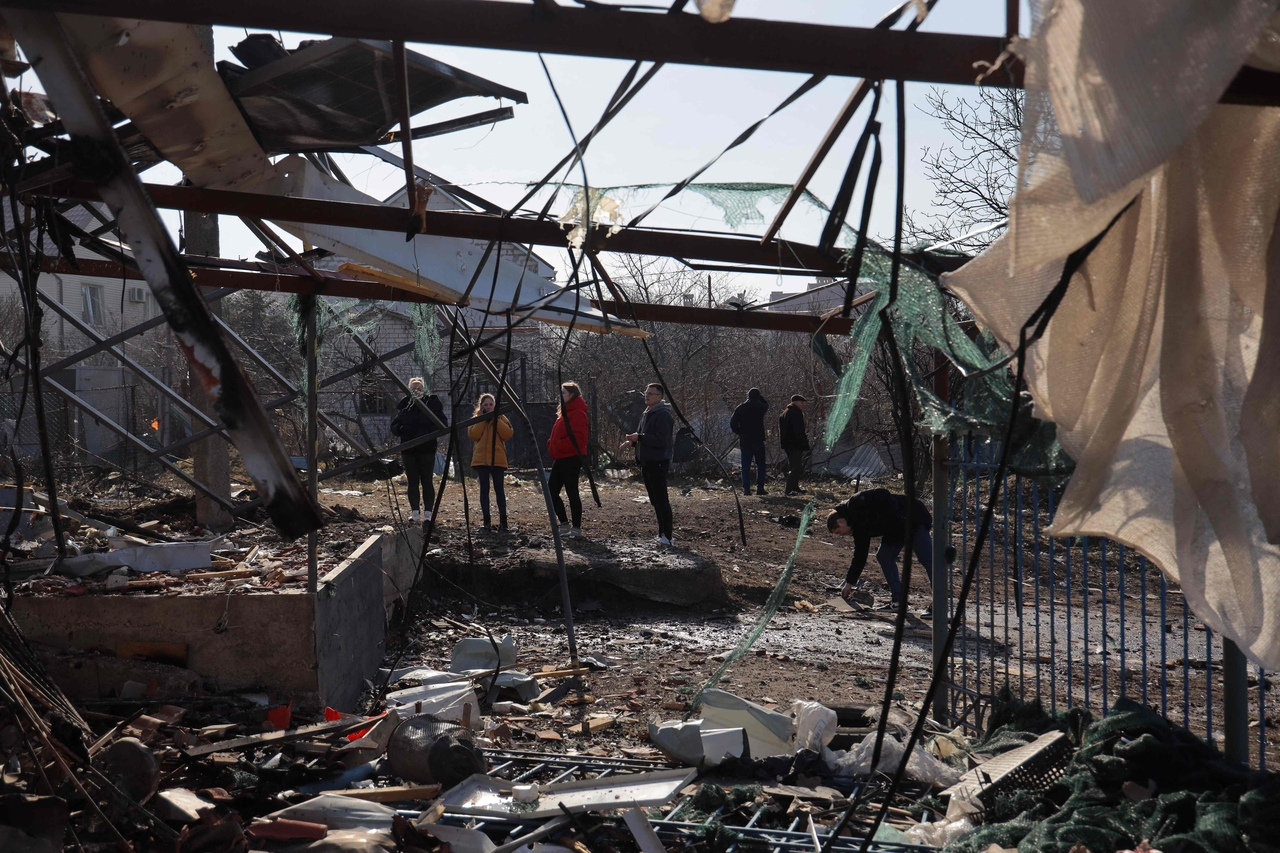 | 지난 3월 우크라이나 오데사에서 드론 공격으로 파괴된 건물 안뜰에 현지 주민들이 서 있다. [AFP] |