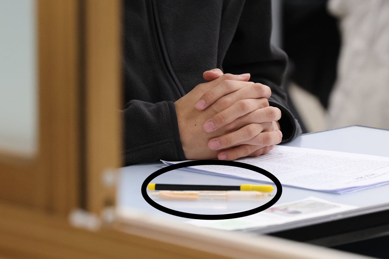 | 2026학년도 대학수학능력시험일인 13일 서울 종로구 경복고등학교에 마련된 고사장에서 수험생이 시험 시작을 준비하고 있는 가운데 놓여있는 컴퓨터용 사인펜. [사진공동취재단] |