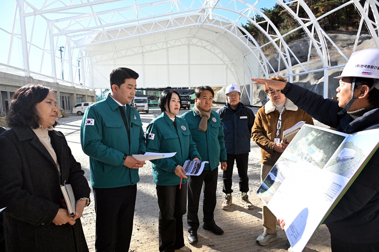 | 울주군의회 행정복지위원회가 울산시 울주군 삼남읍 봉화체육공원 내 울주 실내테니스장 조성사업 현장을 찾아 공사 관계자로부터 사업 현황 설명을 듣고 있다. [울주군 제공] |