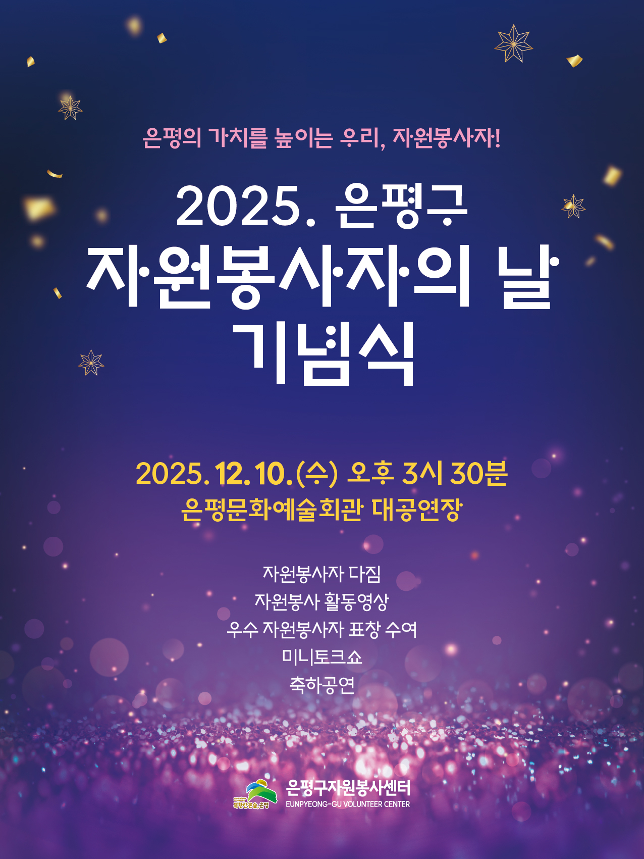 [헤럴드경제=박종일 선임기자]서울 은평구(구청장 김미경)는 오는 10일 은평문화예술회관 대공연장에서 ‘2025 자원봉사자의 날 기념식’을 개최한다.