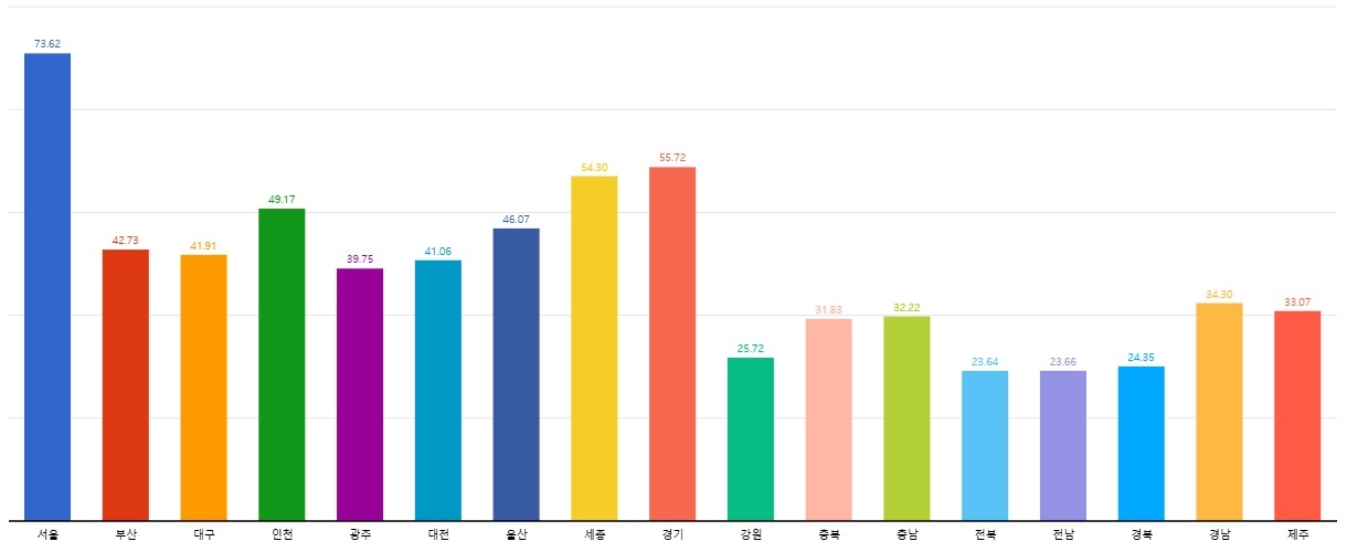 국가데이터처에 따르면, 서울(73.6%), 경기(55.7%), 세종(54.3%)을 제외하면 나머지 시도의 재정자립도는 50%에도 미치지 못한다.