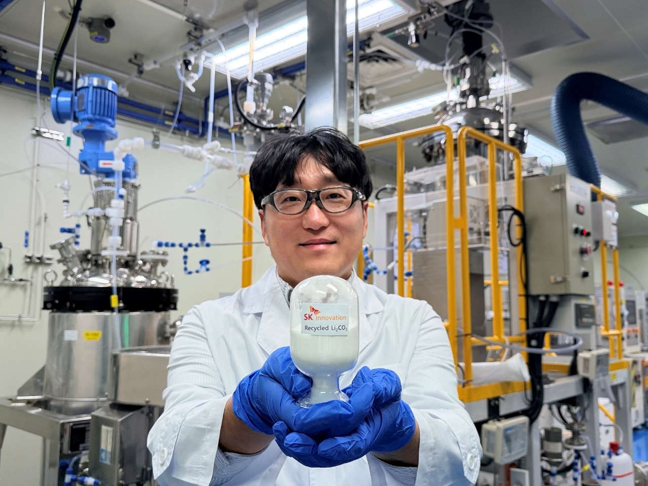 | SK이노베이션 환경과학기술원 연구원이 LFP 배터리 재활용 기술을 통해 회수한 탄산리튬(Li₂CO₃)을 소개하고 있다. [SK이노베이션 제공] |