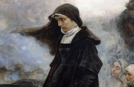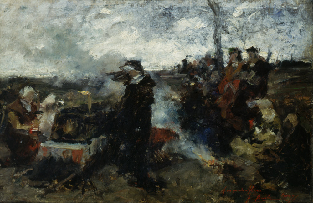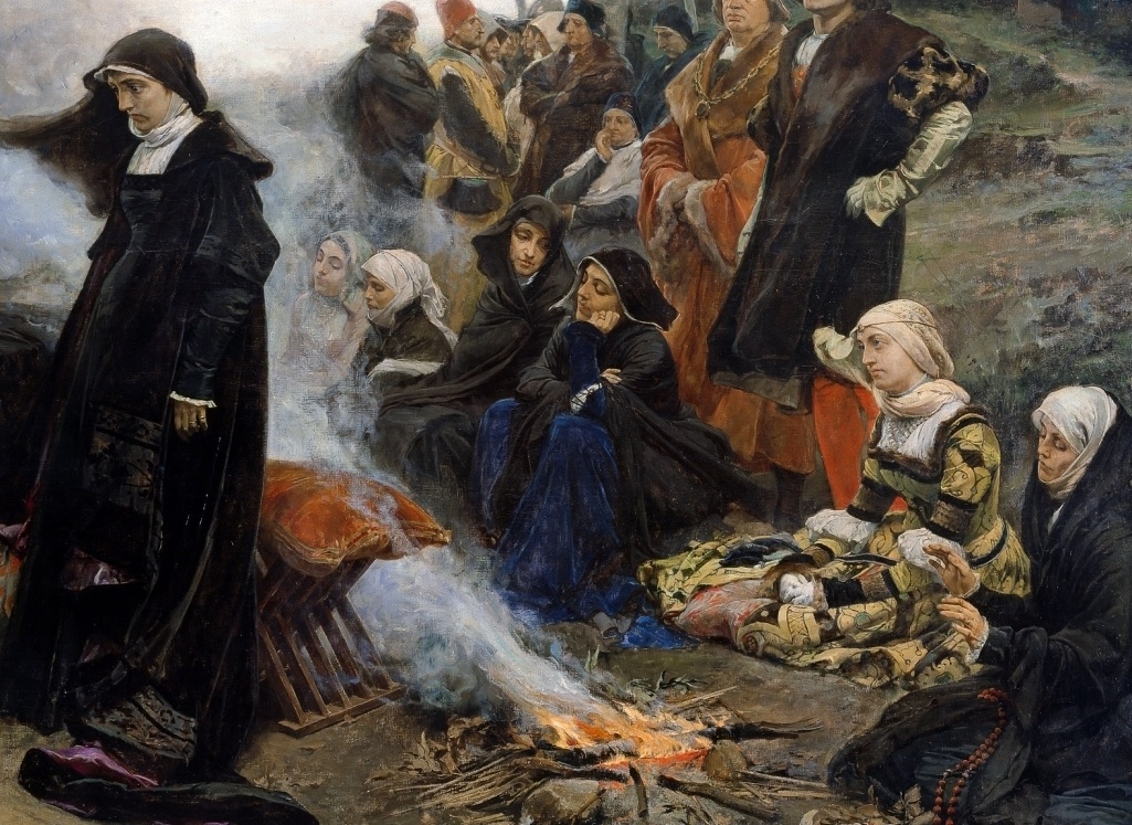 하지만, 이는 당연히 그녀만의 소망일 뿐이다. 여인 주위 모든 이의 표정이 좋지 않다. 졸고, 딴청을 피우고, 이 짓 자체가 한심하다는 듯 대놓고 노려보기도 한다. 하늘은 흐리다. 뿌연 연기가 하늘을 더 흐리게 한다. 땅은 황량하고, 나무는 앙상하고, 저 멀리 보이는 마을도 삭막해보인다. 스페인 화가 프란시스코 프라디야 이 오르티스(Francisco Pradilla y Ortiz·1848~1921)의 그림, <‘광녀’ 후아나>다.