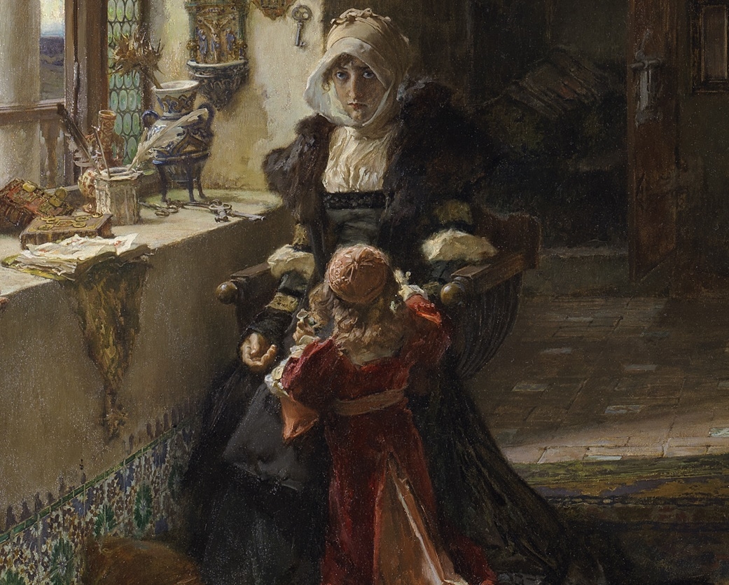 | 프란시스코 프라딜라 이 오르티즈, 딸과 함께 토르데실라스에 사는 ‘미친 여왕’ 후아나 1세(일부 확대), 1906, 캔버스에 유채, 85x146cm, 프라도 미술관 |