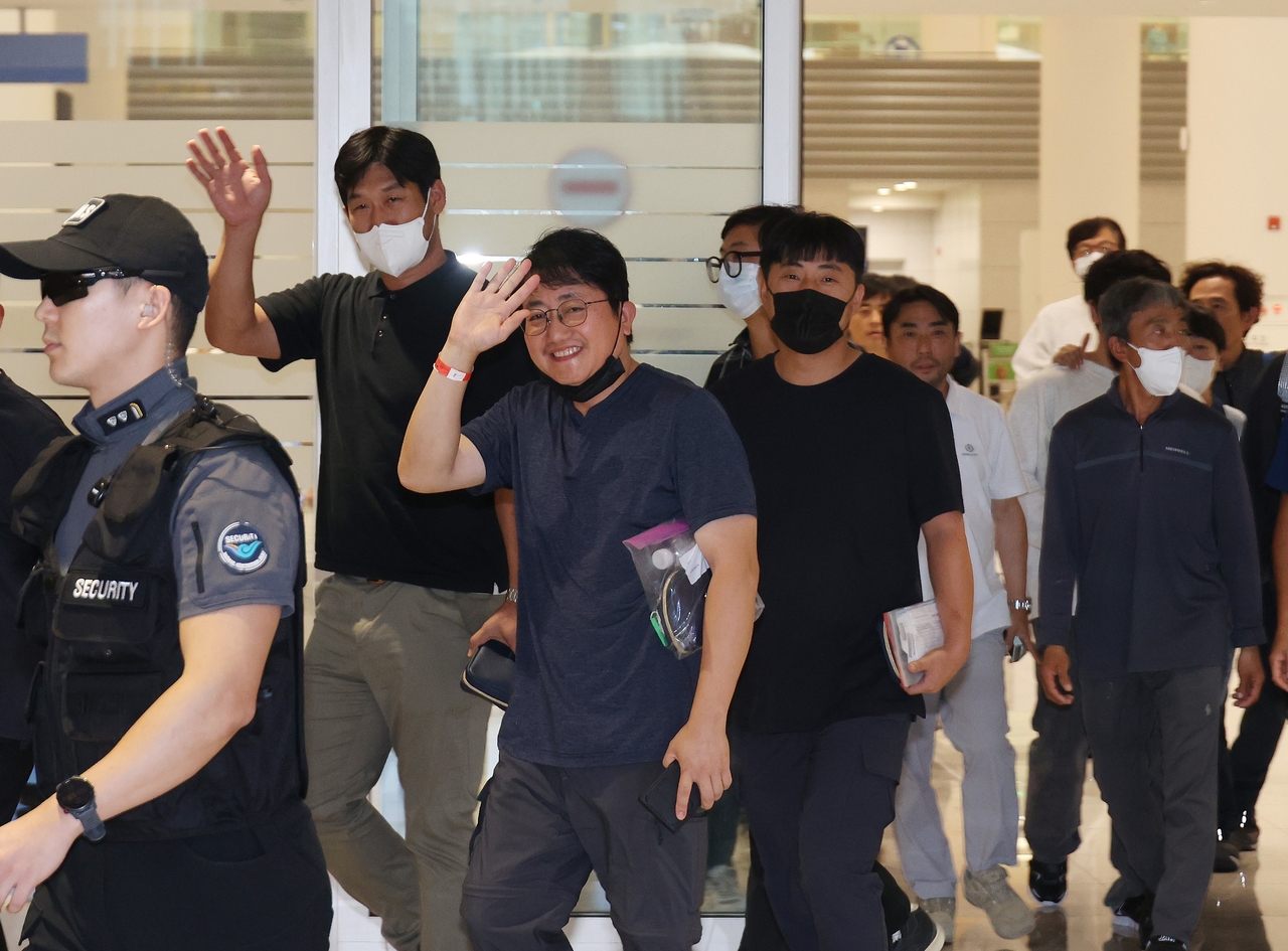 | 미국 이민당국에 의해 조지아주에 구금됐던 한국인 근로자들이 지난 9월 인천국제공항 제2여객터미널 입국장을 나서고 있다. [연합] |