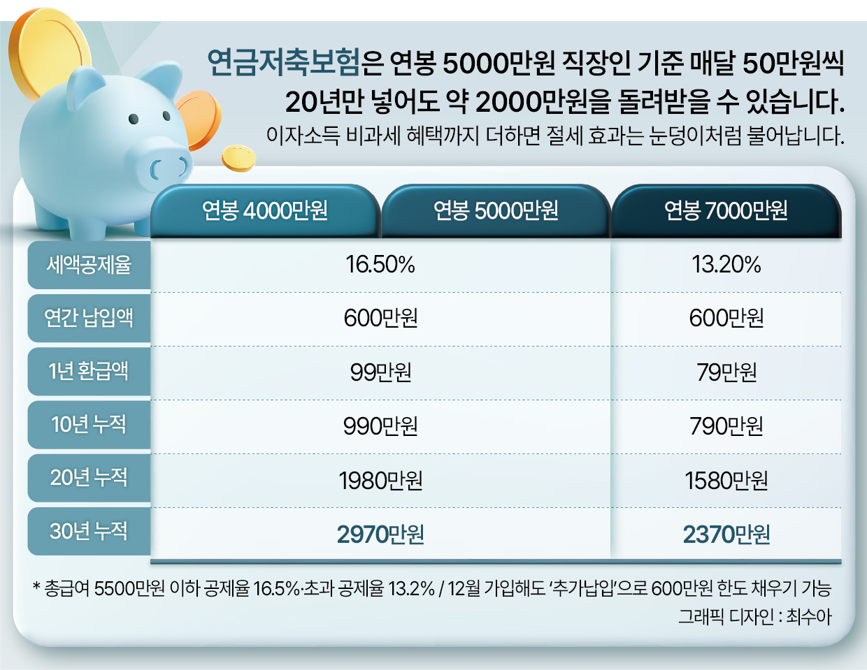 예를 들어 볼까요. 총급여 4000만원인 직장인이 연간 600만원을 내면 매년 99만원(600만원×16.5%)을 돌려받습니다. 10년이면 990만원, 20년이면 1980만원의 절세 효과를 누리는 셈이죠. 총급여 5000만원인 직장인도 마찬가지입니다. 5500만원을 넘지 않는다면 16.5%의 공제를 받을 수 있죠.