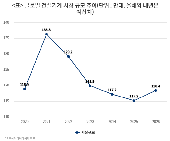 글로벌 건설기계 시장은 대규모 건설경기 부양책이 쏟아졌던 2021년(136만300대)에 정점을 찍은 이후 하락세를 맞았다. 시장 성장을 주도하던 중국이 경기 부진에 빠지면서다. 2022년에는 전년 대비 5% 줄어든 129만2000대에 머물렀다. 2023년(119만0000대)에는 전년 대비 7.9% 감소했고, 2024년(117만2000대)과 올해도 역성장을 이어갔다.
