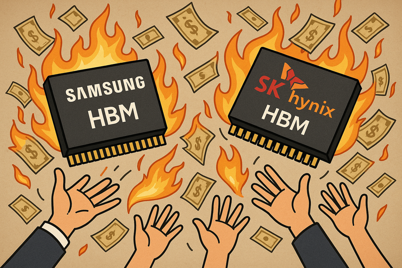 | 삼성전자와 SK하이닉스는 연말 조직개편을 통해 HBM 사업 경쟁력 강화를 꾀하며 내년 한층 더 치열한 경쟁을 예고했다. [챗GPT로 제작] |