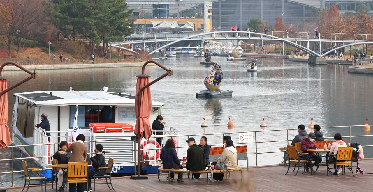 | 인천 연수구 송도센트럴파크를 찾은 시민들이 놀이 보트를 타며 늦가을 정취를 즐기고 있다. [연합] |