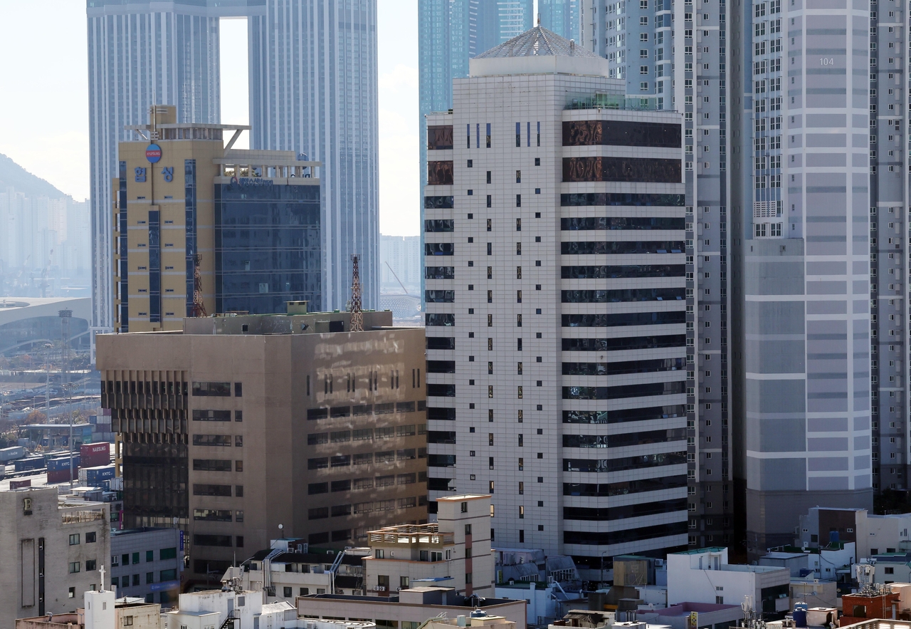| 4일 해양수산부가 이전할 부산 동구 IM빌딩(본관·오른쪽)과 협성타워(별관·왼쪽)에서 막바지 리모델링 공사가 진행되고 있다. [뉴시스] |
