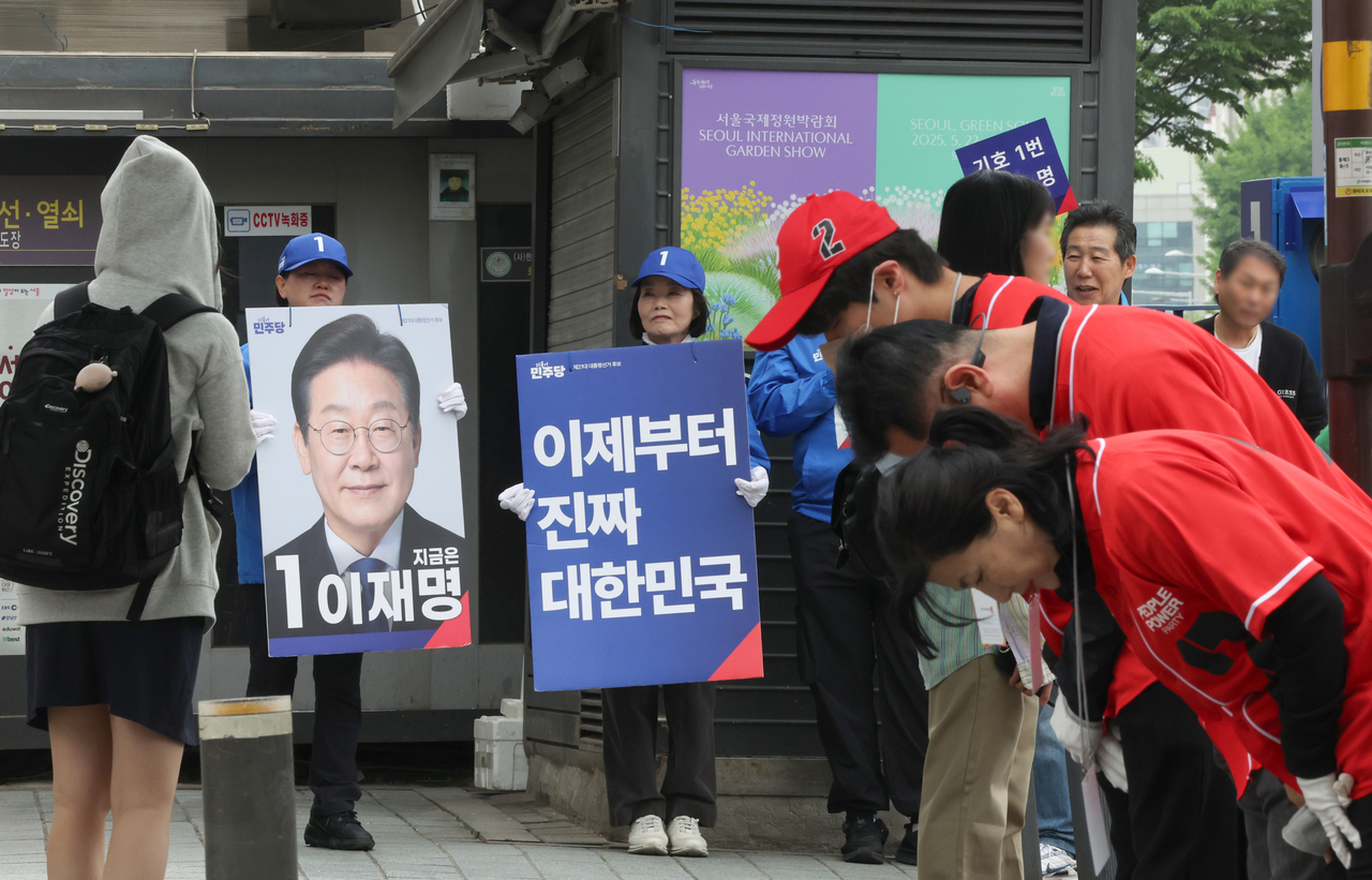 | 제21대 대통령 공식 선거운동 둘째날이었던 지난 5월 13일 서울 서대문구 한 거리에서 기호 1번 더불어민주당 이재명, 2번 국민의힘 김문수 후보 선거운동원들이 시민들에게 인사하고 있다. [연합] |