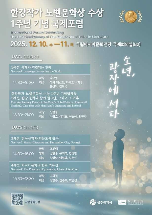 광주광역시(시장 강기정)는 오는 10~11일 국립아시아문화전당 국제회의실에서 ‘한강작가 노벨문학상 수상 1주년 국제포럼(부제: 소년, 광장에 서다)’을 개최한다.