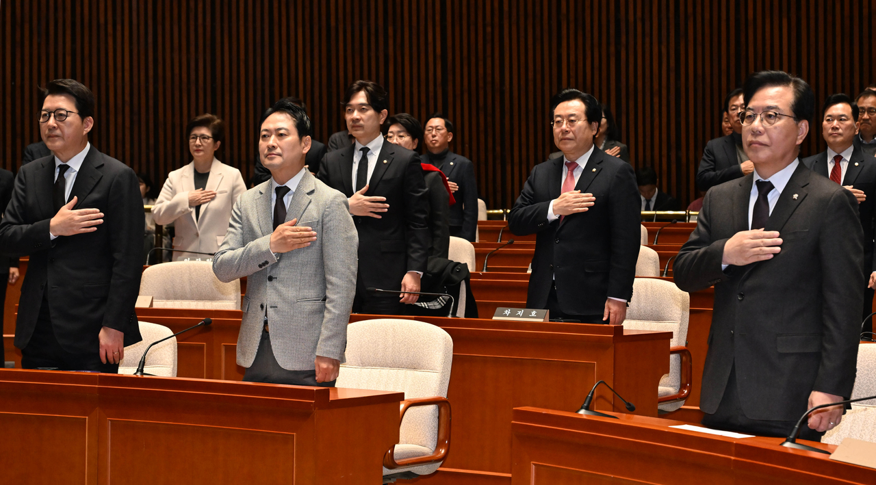 | 장동혁 국민의힘 대표와 송언석 원내대표가 8일 오전 국회에서 열린 의원총회 및 이재명 정권 독재 악법 국민 고발회에서 국민의례 하고 있다. 이상섭 기자 |