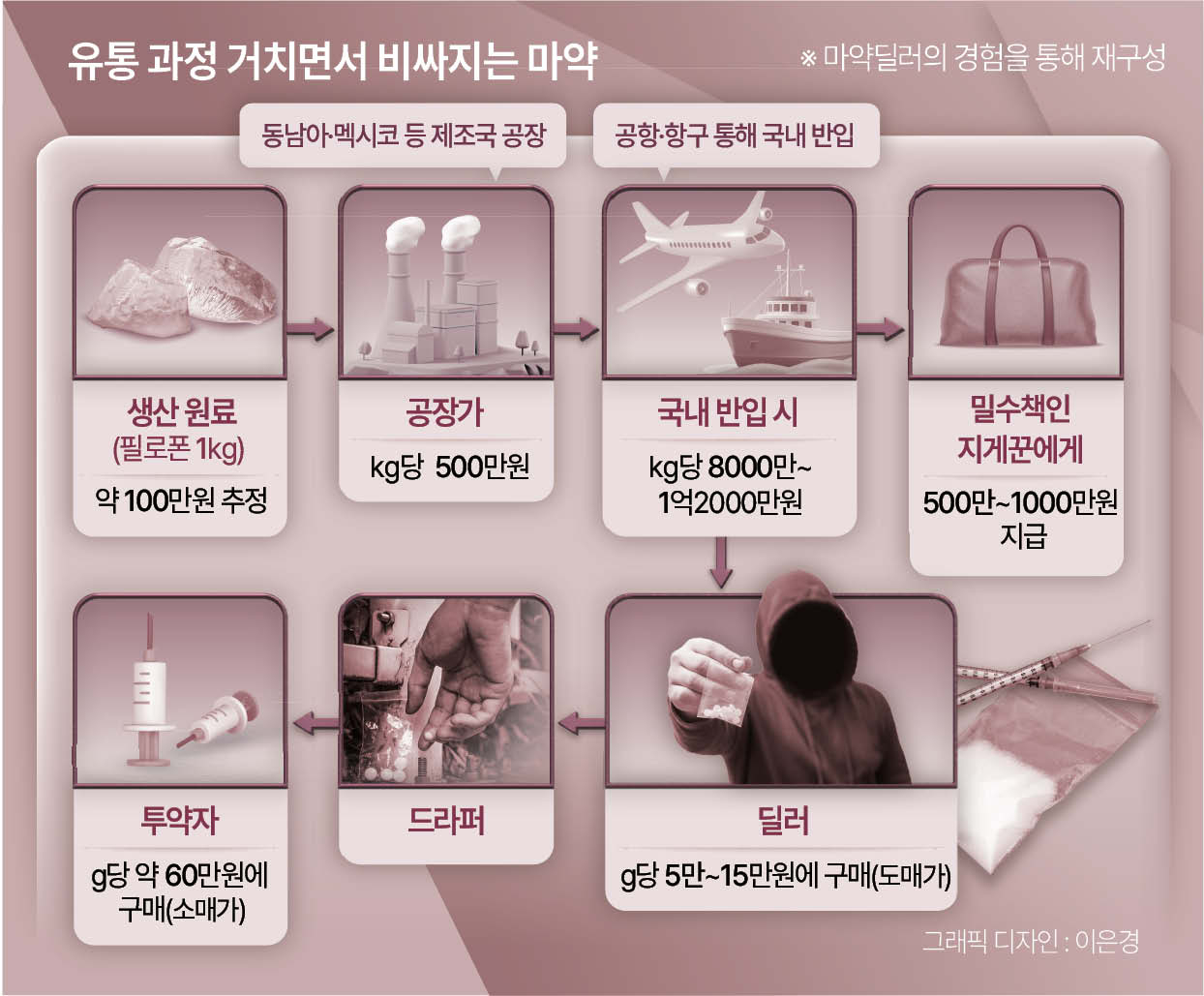 동남아 등 지역에서 제조된 마약은 ‘지게꾼(밀수책)’을 거쳐 한국에 넘어온다. 배편으로 다른 짐에 섞여서 유입되거나 비행편으로 사람이 몸에 숨겨 들어오기도 한다. 일단 한국에 도착한 필로폰 1kg은 대략 1억2000만원이다. 위험을 감수하고 밀수한 지게꾼은 500만원쯤 보수를 받는다. 조직은 점조직처럼 퍼진 도매딜러들에게 물량을 넘기고 작은 딜러들에게 공급한다.