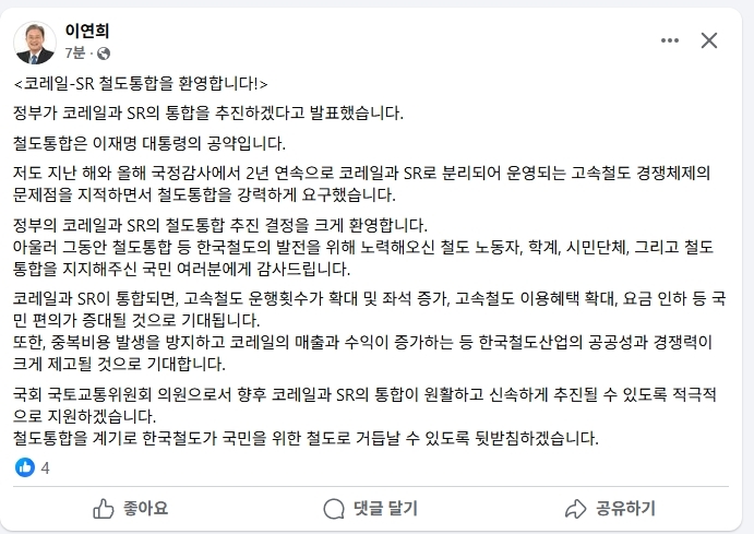 이 의원은 “정부의 코레일과 SR의 철도통합 추진 결정을 크게 환영한다”며 “코레일과 SR이 통합되면 고속철도 운행횟수 확대 및 좌석 증가, 고속철도 이용혜택 확대, 요금인하 등 국민 편의가 증대될 것으로 기대된다”고 썼다.