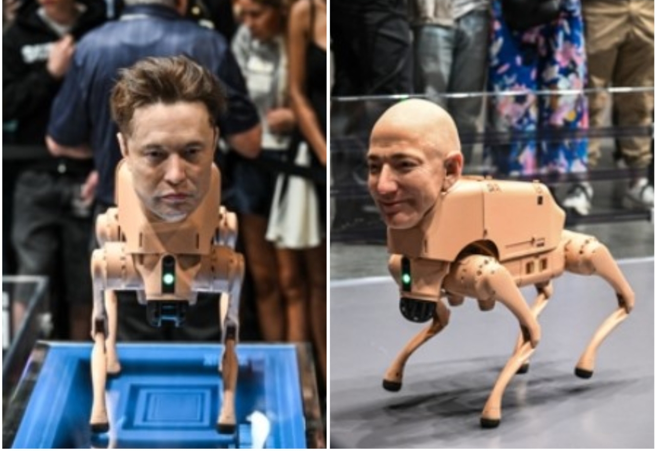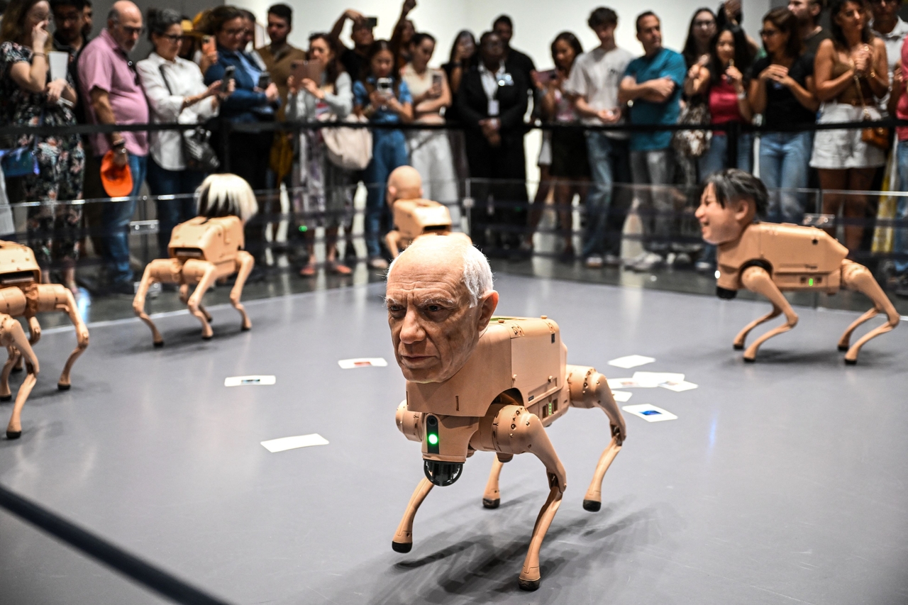 이 기괴한 로봇 개들은 머스크와 베이조스뿐 아니라 마크 저커버그 등 빅테크 CEO와 피카소, 워홀 등 예술 거장 5인의 얼굴을 정교하게 재현한 마스크를 쓰고 전시장 곳곳을 돌아다닌다.