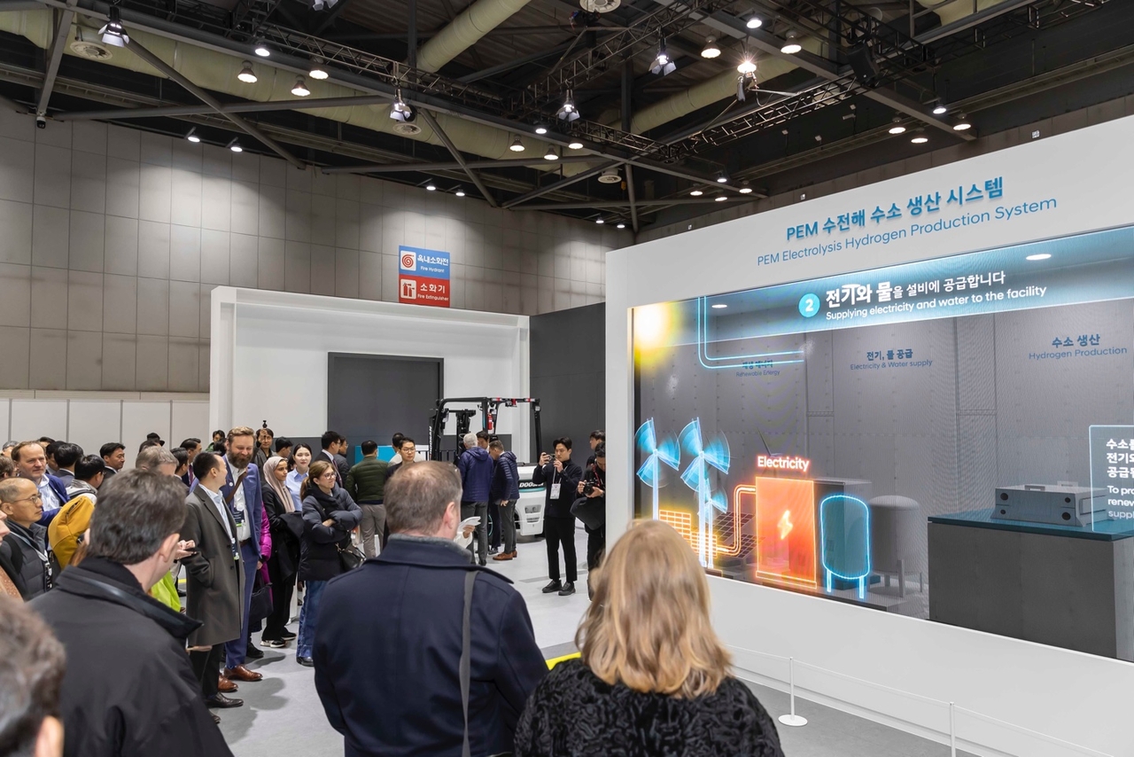 | 지난 4일부터 7일까지 경기도 고양시 킨텍스에서 개최된 ‘월드 하이드로젠 엑스포 2025’를 찾은 관람객들이 현대차그룹 수전해 수소 생산 시스템에 관해 설명을 듣고 있다. [현대차그룹 제공] |