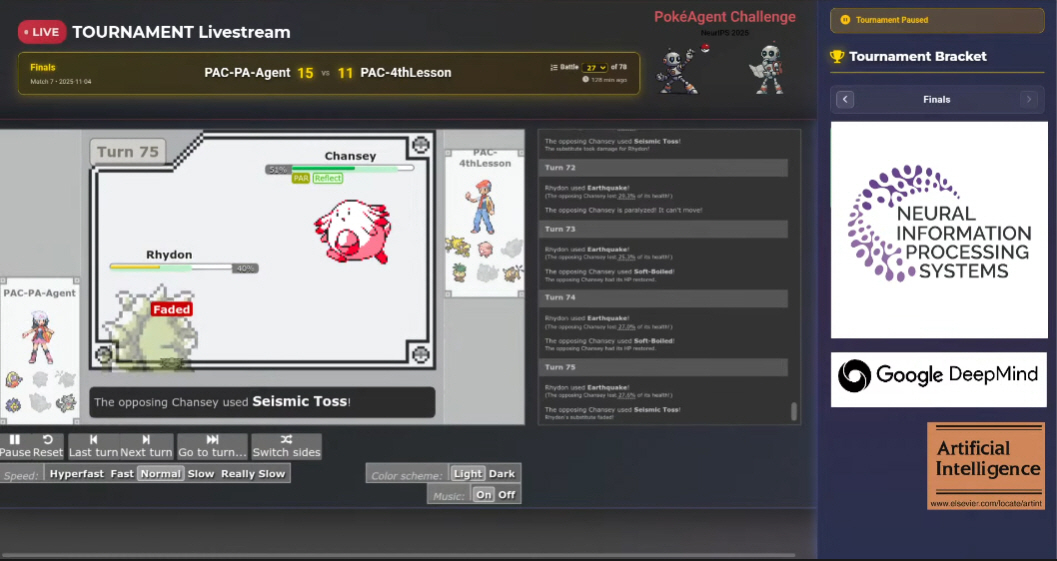 [헤럴드경제=구본혁 기자] 광주과학기술원(GIST)은 AI융합학과 대학원생들로 구성된 ‘네 번째 레슨(4thLesson)’ 팀이 세계 최고 권위의 인공지능(AI) 학회 ‘뉴립스(NeurIPS)’가 주관한 국제 AI 대회 ‘2025 포케에이전트 챌린지’에서 ‘대전(배틀링) 트랙: 포켓몬 1세대 규칙 부문(Gen 1 OU)’ 준우승을 차지했다고 밝혔다.
