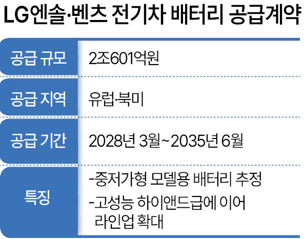 8일 LG에너지솔루션은 메르세데스-벤츠 AG와 2조601억원 규모의 배터리 공급계약을 체결했다고 공시했다. 이는 지난해 전체 매출 25조6196억원의 8%에 해당하는 규모다. 공급 지역은 유럽과 북미로, 계약기간은 2028년 3월 1일부터 2035년 6월 30일까지다. LG에너지솔루션 관계자는 “고객사와 협의에 따라 공시 내용 외 추가적인 내용은 밝힐 수 없다”고 전했다.