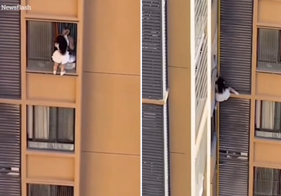 더 선 등 외신에 따르면 최근 중국 소셜미디어(SNS)에는 광동성 한 아파트 10층 난간에 흰옷을 입은 여성이 매달려 위태롭게 이동하는 모습이 담긴 영상이 확산했다.