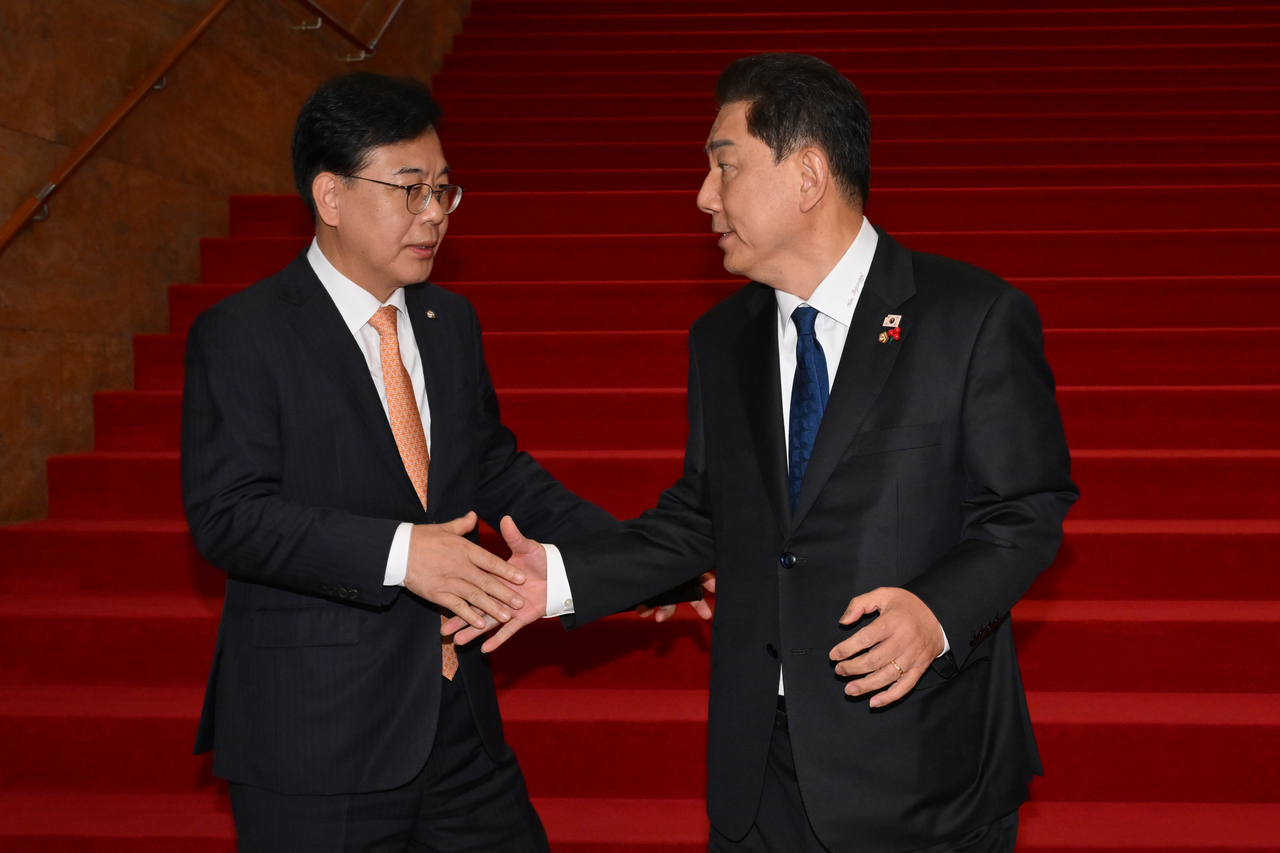 | 김병기(오른쪽) 더불어민주당 원내대표와 송언석 국민의힘 원내대표가 9일 국회에서 우원식 국회의장 주재 하의 회동을 마치고 악수하고 있다. 이상섭 기자 |