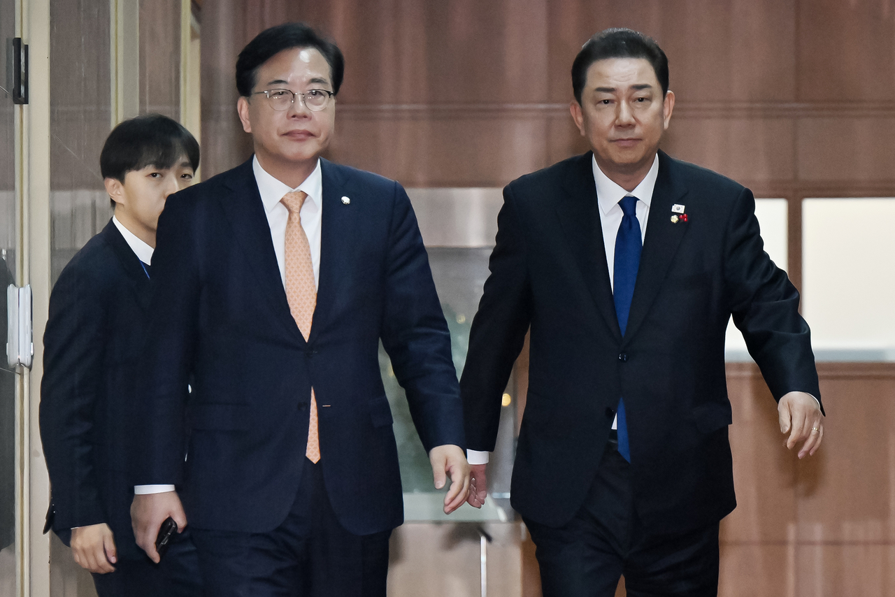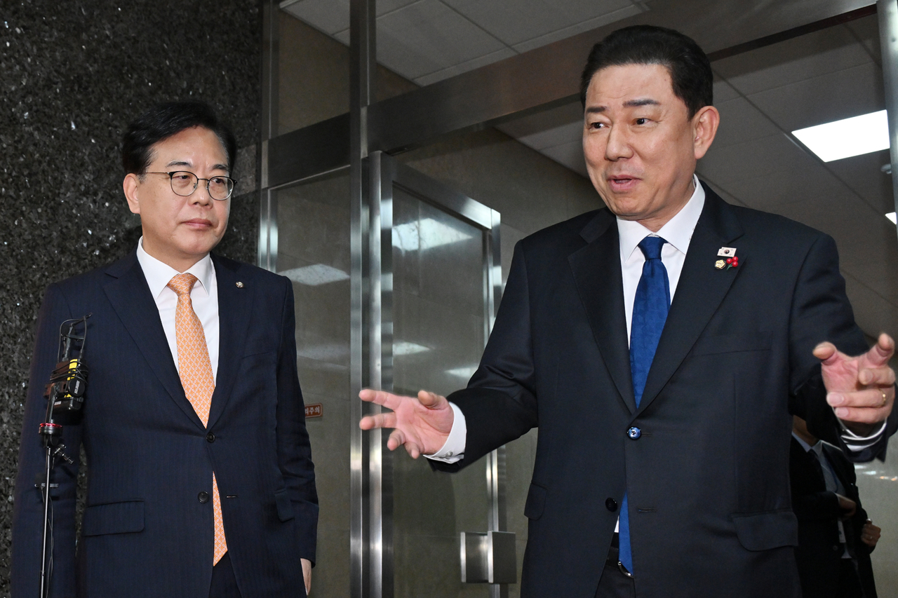 | 김병기(오른쪽) 더불어민주당 원내대표와 송언석 국민의힘 원내대표가 9일 국회에서 우원식 국회의장과 회동을 가진 뒤 의장실을 나서고 있다.이상섭 기자 |