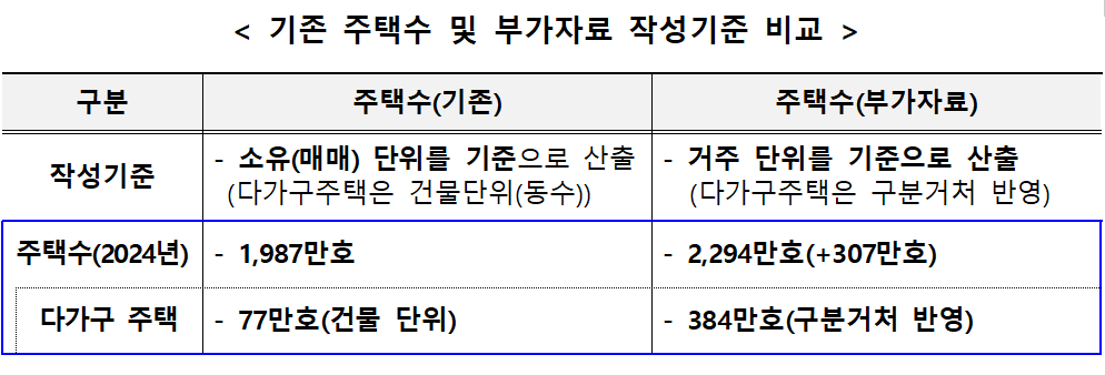 이번 부가자료는 건축물대장, 전기시설 명부 등 행정자료와 2024년 가구주택기초조사(전수조사)를 결합해 산출됐다. 국가데이터처는 앞으로도 매년 기존 주택 수와 부가자료를 병행 제공할 계획이다.