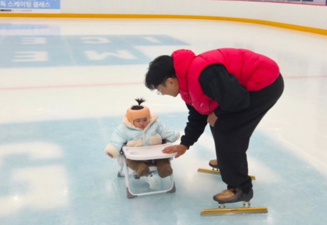 사진 속 이규혁은 아이스링크 위에서 썰매처럼 변형한 아기 의자를 밀며 딸 해이와 시간을 보내고 있다.