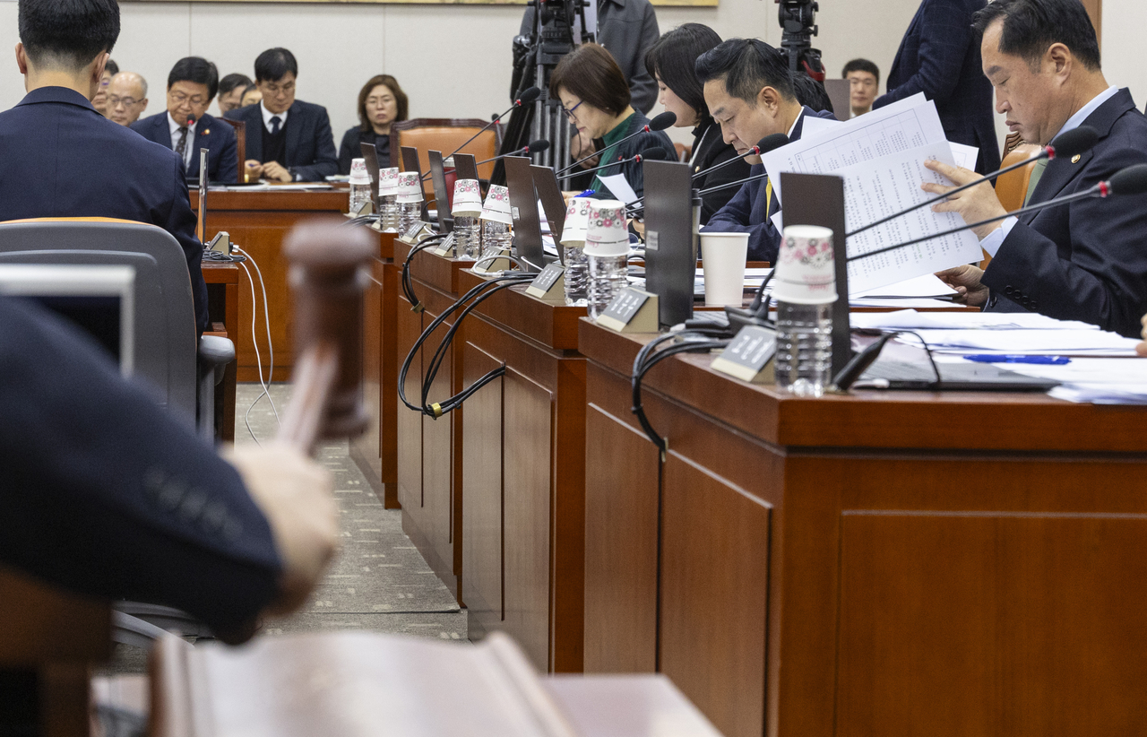 | 국회 교육위원회 김영호 위원장이 9일 국회에서 열린 교육위원회 전체 회의에서 상정된 법안을 처리하고 있다. [연합] |
