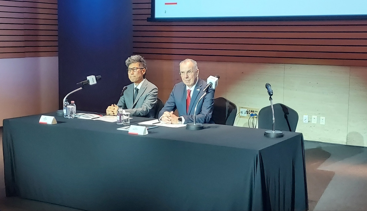 | 박준성(왼쪽부터) 랑세스코리아 대표이사와 후버트 핑크 랑세스 부회장이 10일 서울시 여의도 FKI타워에서 열린 기자간담회에 기자들의 질문을 듣고 있다. 한영대 기자 |