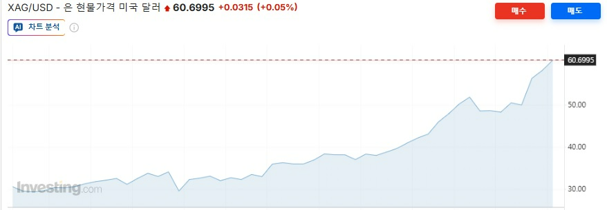 [헤럴드경제=김영철 기자] 은 가격이 사상 처음으로 온스당 60달러를 돌파했다. 오는 10일(현지시간) 열리는 미국 연방공개시장위원회(FOMC) 정례회의에서 기준금리 인하가 유력시되는 가운데 산업 수요가 급증한 것이 은 가격을 끌어 올렸다.