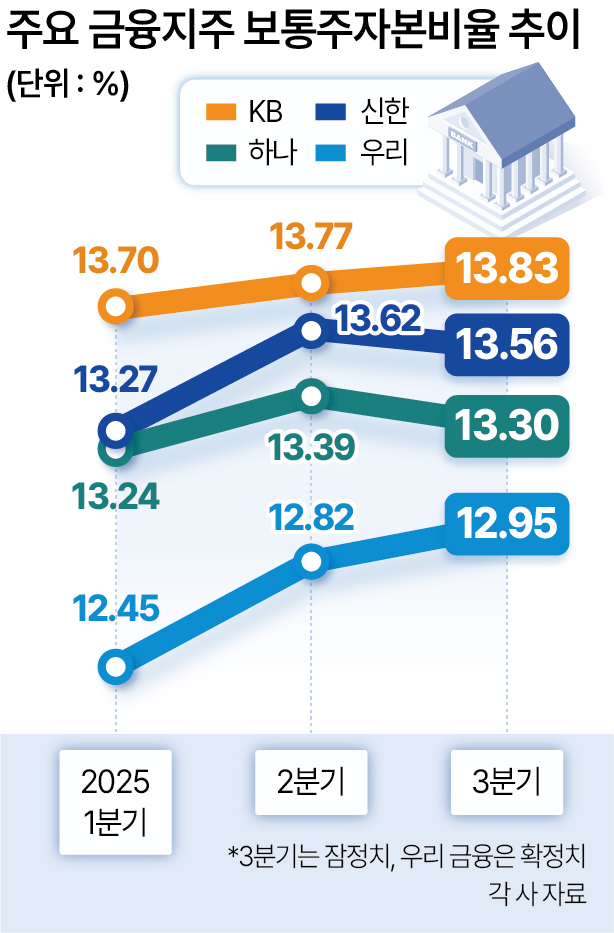 시장에서는 4분기 중 환율 상승과 과징금 부과 등의 영향이 반영되면 각 지주가 목표로 하는 13~13.5%선을 밑돌 가능성이 있다는 분석이 제기된다. 통상 주요 지주가 13% 초과분을 주주환원에 활용하겠다는 계획을 세우고 있다는 점에서 주주환원 여력이 하락할 여지도 있다.