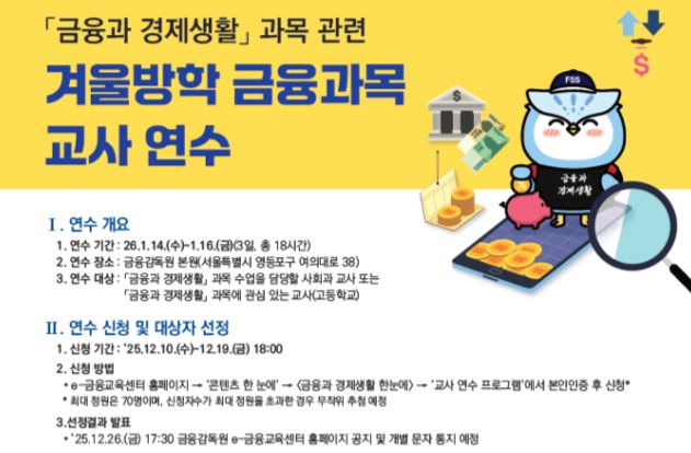 [헤럴드경제=김은희 기자] 금융감독원은 내년 1월 14일부터 사흘간 고등학교 ‘금융과 경제생활’ 과목 담당 교사 양성 지원을 위한 금융과목 교사 연수 프로그램을 실시한다고 10일 밝혔다.