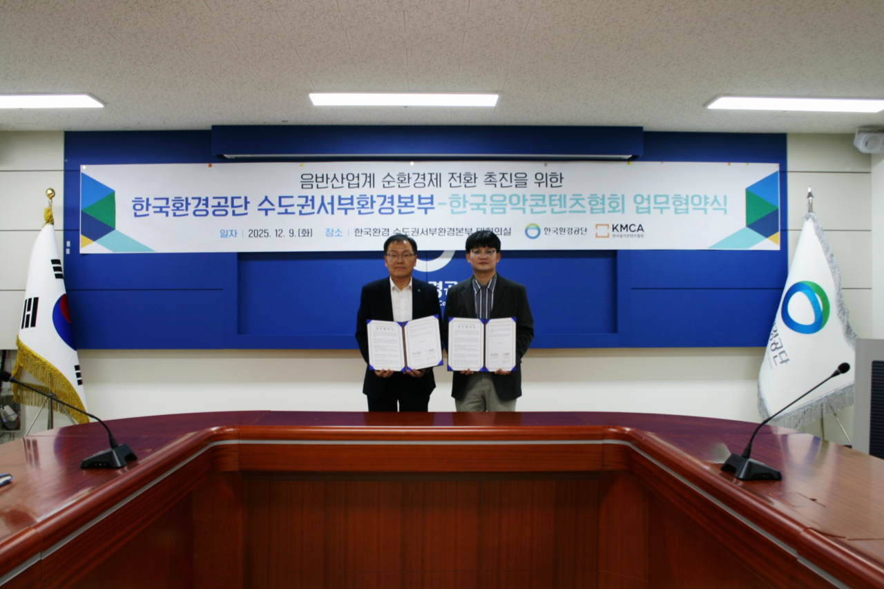 [헤럴드경제 = 서병기선임기자]한국음악콘텐츠협회는 9일 한국환경공단 수도권서부환경본부와 ‘음반산업계 순환경제 전환 촉진을 위한 업무협약(MOU)’을 체결했다고 밝혔다.