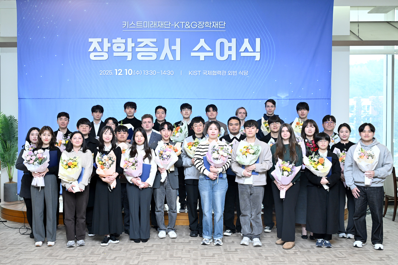 이어 진행된 KIST 학생연구원 장학증서 수여식에서는 내·외국인 학생연구원 총 33명이 장학생으로 선정돼 각 300만 원의 장학금을 받았다. 이 장학금은 KT&G장학재단이 글로벌 과학기술 인재 육성을 위해 후원한 1억 원의 기금으로 마련됐다.