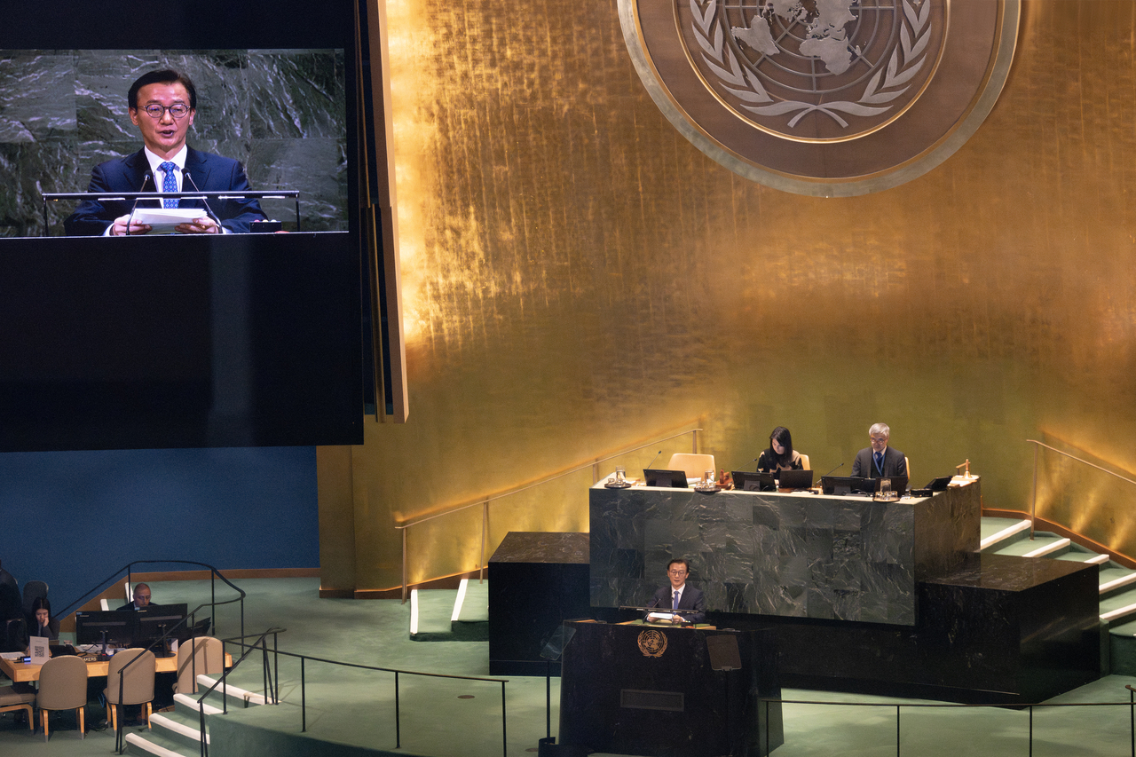 | 전재수 해양수산부 장관은 8일(현지시간) 미국 뉴욕에서 열린 제80차 유엔총회에 참석, 2028년 제4차 UN해양총회 대한민국-칠레 공동 개최를 확정하기 위한 결의안에 대한 제안 설명에 나섰다. [해양수산부 제공] |