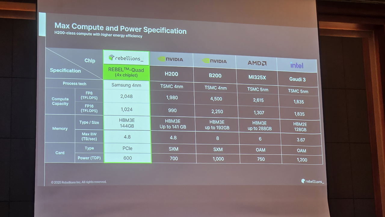 그러면서 “리벨리온의 리벨쿼드는 2PF(페타플롭스) 성능을 갖춰 국내 가속기 중에서는 가장 높은 수치를 기록했고 절대수치로만 비교하면 엔비디아의 가속기 H200급이라고 볼 수 있다”며 “엔비디아의 H200보다는 전력이나 가격적인 측면에서 매력이 있다”고 말했다.