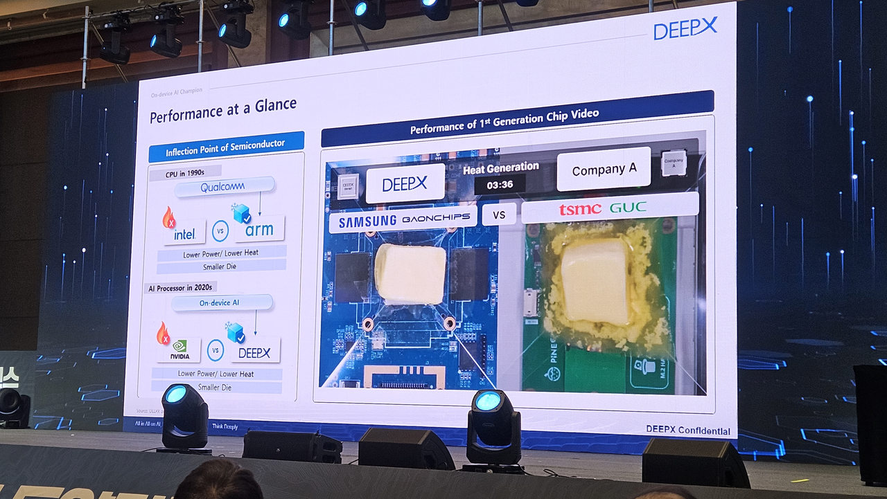 온디바이스 AI 반도체 기업 딥엑스의 김정욱 부사장은 이날 “7월부터 양산을 해 약 300개 업체와 기술검증(PoC)를 했고, 약 20개 업체와 사업화를 진행 중”이라고 밝혔다. 데이터센터의 전력 문제 때문에 NPU의 발열을 잡는 게 업계의 숙제다. 버터는 약 36도 이상 온도에서 녹는데, 딥엑스는 칩 위에 버터를 올려놓고 AI모델을 작동시켜 버터가 녹는지 테스트하는 ‘버터 벤치마크’를 통해 발열 기술을 선보이고 있다.