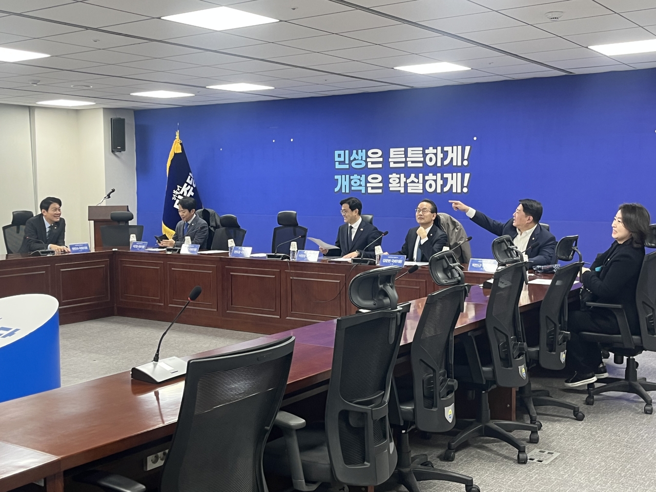 | 더불어민주당 디지털자산 태스크포스(TF)가 11일 오전 금융위원회와 디지털자산기본법을 두고 비공개 논의를 진행했다. 사진은 이날 논의 전 자리에 착석한 TF 의원 모습. (왼쪽부터) 한민수·이강일·이정문·강준현·박민규 의원[사진=유동현 기자] |