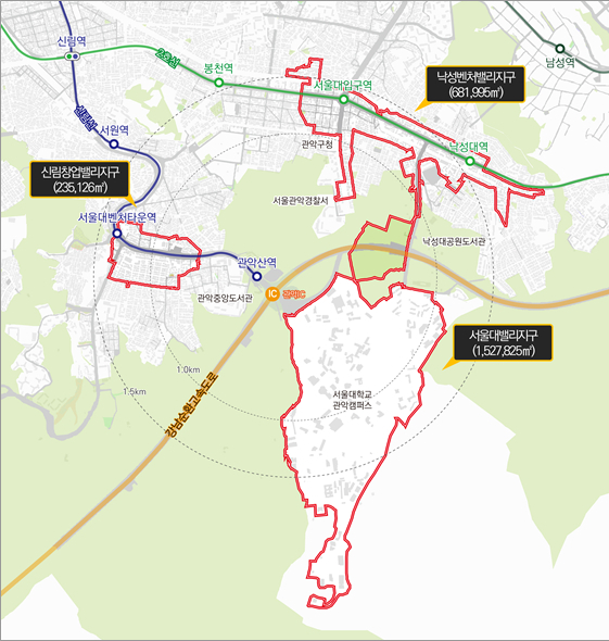 | 지도가 붉은색 선으로 구획된 지역들을 나타내고 있는 사진이다. 지도에는 신림 벤처 밸리 지구, 낙성대 벤처 밸리 지구, 서울대 캠퍼스 지구라고 쓰여 있다. |