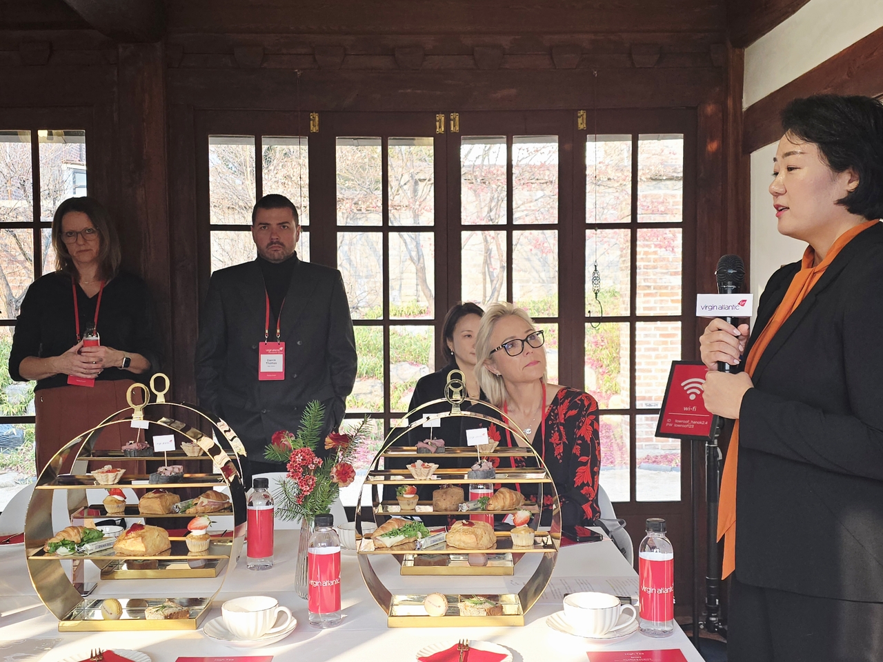 | 버진애틀랜틱항공사가 10일 오후 서울의 한 한옥식당에서 미디어간담회를 가졌다. 윤은주 한국지사장(오른쪽)이 내년 3월 취항할 인천-런던 노선에 대해 설명하고 있다. |