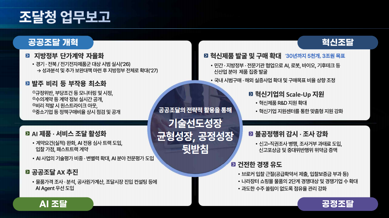 혁신조달 강화와 AI 산업 육성 등 기업과 성장과 도약을 집중 지원한다. 오는 2030년까지 혁신조달 규모 3조 원 달성을 목표로 민간 및 지방정부와 협력해 AI, 로봇, 바이오 등 신산업 분야의 혁신제품을 적극 발굴한다. 특히 ‘혁신제품 시범구매’ 규모를 대폭 확대(‘25년 529억원 → ’26년 839억원)하고, R&D 지원 확대 및 피드백 강화 등을 통해 혁신제품의 레벨업을 유도한다.