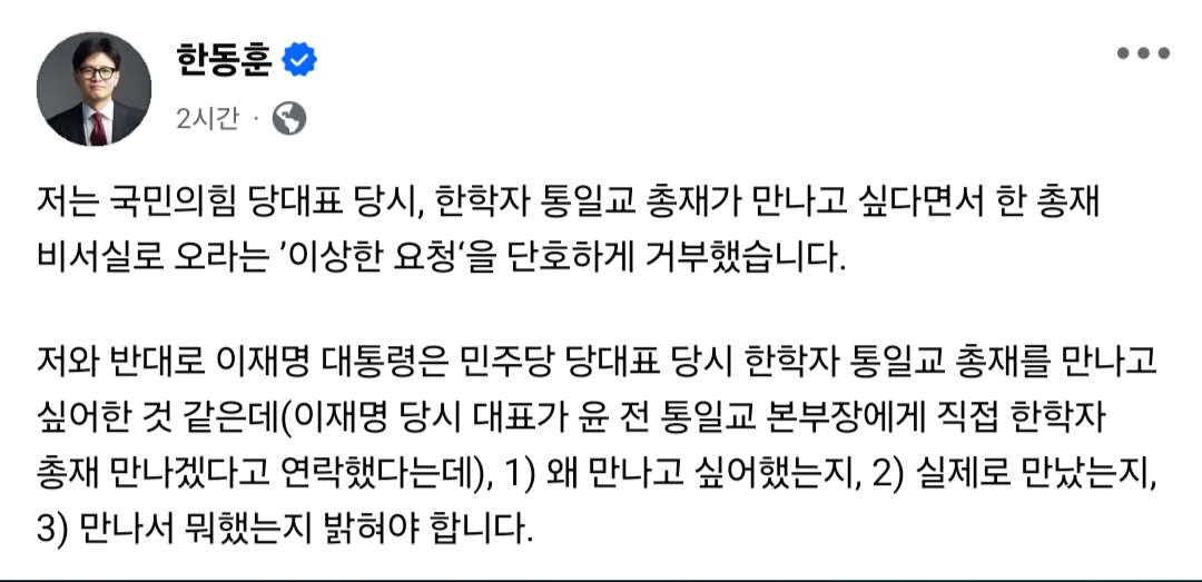 다만 한 전 대표는 이재명 대통령을 향해 “(더불어민주당 대표 시절)윤영호 전 통일교 본부장에게 직접 ‘한학자 총재를 만나겠다’고 연락했다는 이야기도 있다”면서 “그렇다면 왜 만나려 했는지, 실제로 만났는지, 만나서 무엇을 했는지 밝혀야 한다”고 강조했다.