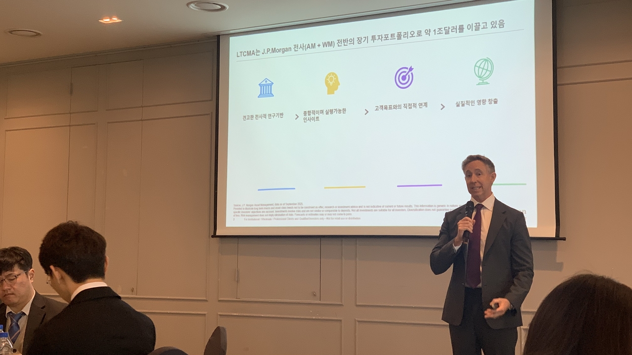 | 캐리 크레이그 JP모건자산운용 글로벌마켓전략가가 ‘2026년 장기자본시장가정’(LTCMA)에 대해 발표하고 있다. 문이림 기자 |