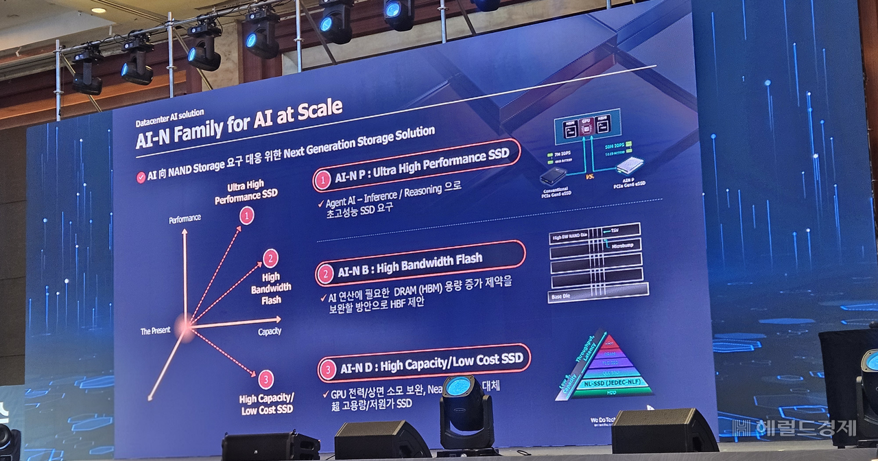 지금껏 낸드는 D램보다 대역폭과 동작속도가 낮아 홀대를 받아왔지만 AI가 폭발적으로 성장하고 있는 가운데 변신을 거듭하고 있다. 앞서 SK하이닉스는 차세대 낸드 솔루션인 ‘AIN(AI-NAND) 패밀리’를 공개한 바 있다. AI 추론 시장에 대응해 성능(P)·대역폭(B)·용량(D)을 특화한 제품군이다.