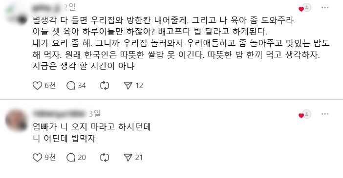 실질적인 도움을 담은 제안도 이어졌다. 하동에 산다는 누리꾼은 “잠시 머물 방 한 칸을 내어줄 수 있다”고 전했다. 아이 셋을 키운다고 밝힌 한 이용자는 “우리 집 와서 하루 이틀만 육아 도와줘 보라. 따뜻한 밥 한 끼 먹고 다시 생각하자”는 댓글을 남겼다.