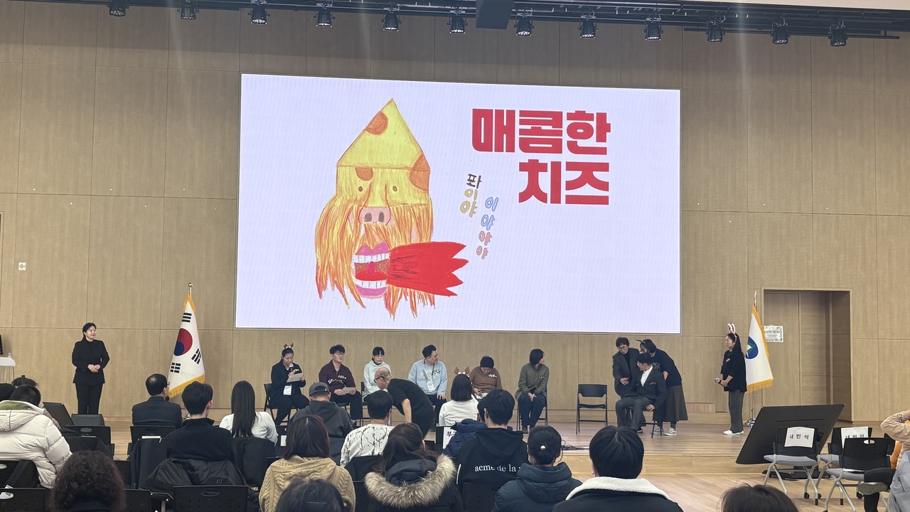 | 강당 무대에서 사람들이 의자에 앉아 있고, 배경에는 ‘매콤한 치즈’라는 제목과 치즈 모양의 그림이 있는 스크린이 보이는 사진이다. 무대 왼쪽에는 태극기가, 오른쪽에는 광진구 깃발이 세워져 있다. |
