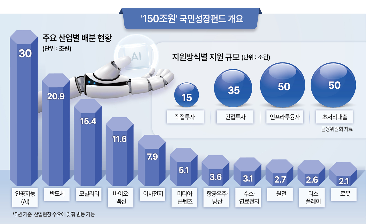 국민성장펀드는 정부보증채권 75조원과 민간자금 75조원을 합쳐 150조원 규모로 조성된다. AI, 반도체, 바이오, 로봇 등 첨단전략산업과 관련 생태계를 폭넓게 지원하는 것을 목표로 한다. 산업을 직접 영위하는 기업뿐 아니라 지분투자 펀드 등을 통해 중소·기술기업 전반을 지원하게 된다.